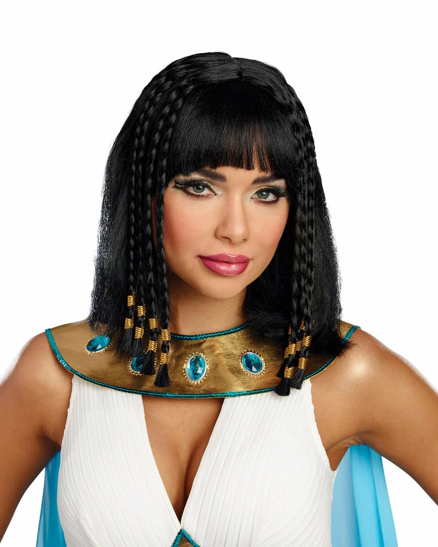 Shoulder-length, jet-black synthetic wig styled with side braids and bangs (One-Piece Set). Pair with Dreamgirl’s “Queen of De Nile” for the perfect Egyptian queen look or pair with Dreamgirl’s “Holy Ship!” for the perfect swashbuckling pirate look.