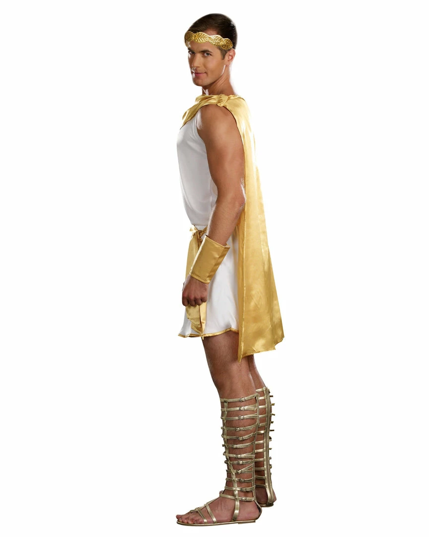 Every inch of this mighty God is simply heavenly! Reign over your kingdom in this stunning men’s white tunic with attached gold cape that also comes with a gold leaf headpiece, removable belt and wrist cuffs.
