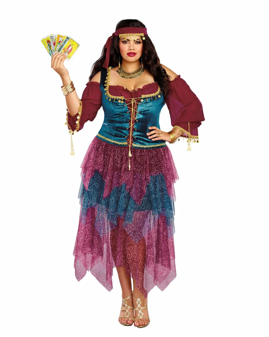 Featuring a peasant-style dress with a multi-tiered skirt. Layered on top of this vibrant dress is a velvet bodice with lace detail, completing the gypsy look. The bodice and dress both have gold trim detailing to add the little bit of glitter that every gypsy needs. Complete the look with the matching headwrap with gold coin trim that this gypsy costume comes with. Throw on some sandals and large hoop earrings and you now have a head-turning costume.