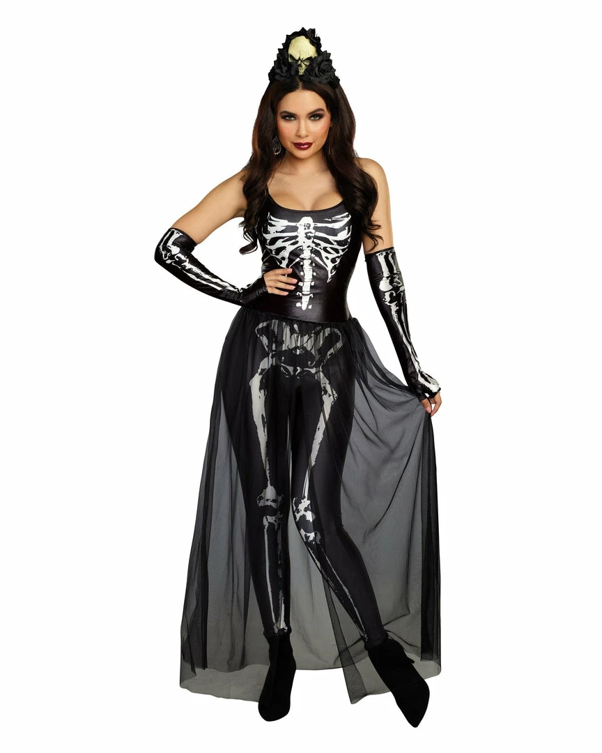 - Four-piece women’s costume set includes skeleton-print top, attached sheer skirt, skeleton-print leggings, and black skull headpiece.