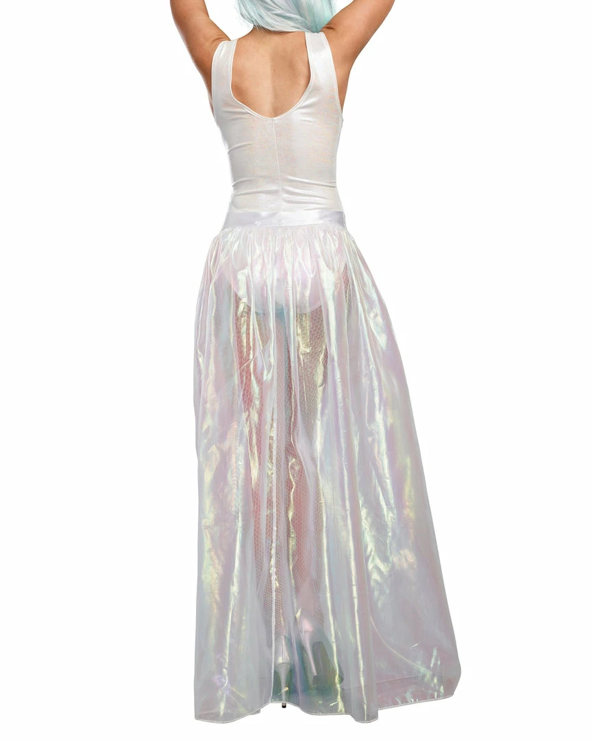 Shimmering white open-front holographic sheer skirt features a ribbon waist band and tie-front closure. Pair with Dreamgirl’s “Spaced Bodysuit” (one-piece set).