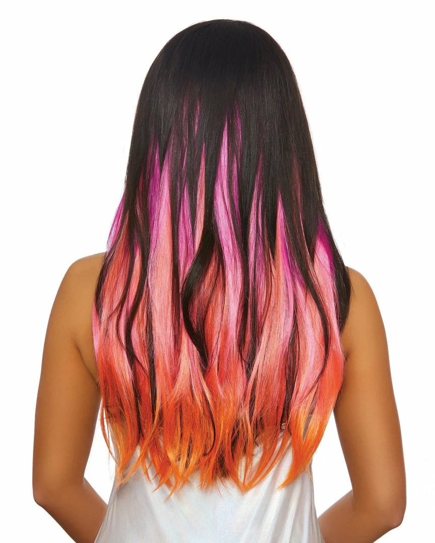 Long, straight layered Hair Extensions in Magenta/Neon Pink/Orange. The set comes with three 23” long clip-on pieces: one 9” center track and two 2” sidetracks.