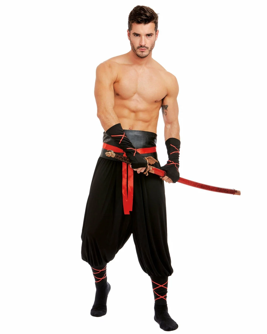 This versatile Ninja costume can be worn with or without the dragon screen-printed hooded shirt. Includes pants, face mask, fingerless gloves, and faux-leather Obi belt.