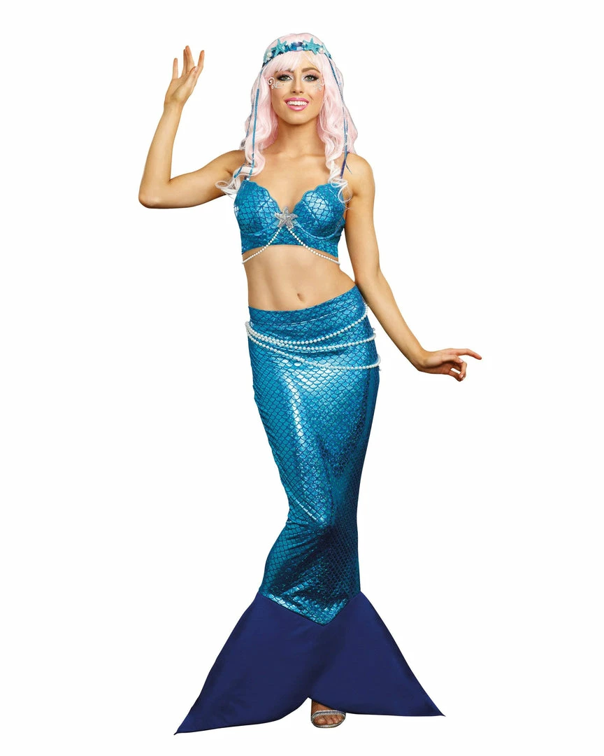 Brilliant blue holographic-print mermaid skirt with three strands of faux-pearls, contrast fish tail, and back slit.
