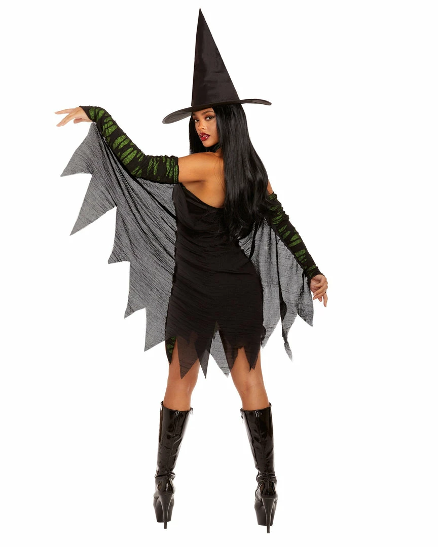 This enchanting witch costume features a black shredded knit dress with lime green accents, attached sleeves and a gauze cape. Also includes belt with an oversized buckle and a classic wicked witch hat.Â