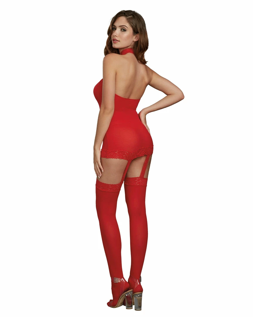 Sheer dress with lace trim and attached garters and thigh high sheer stockings (thong not included).