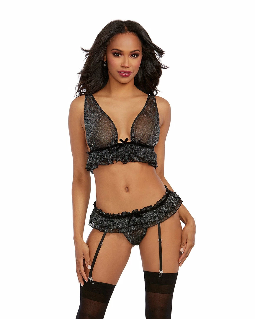 - Matching garter panty with double ruffle accent, velvet trim & bow detail