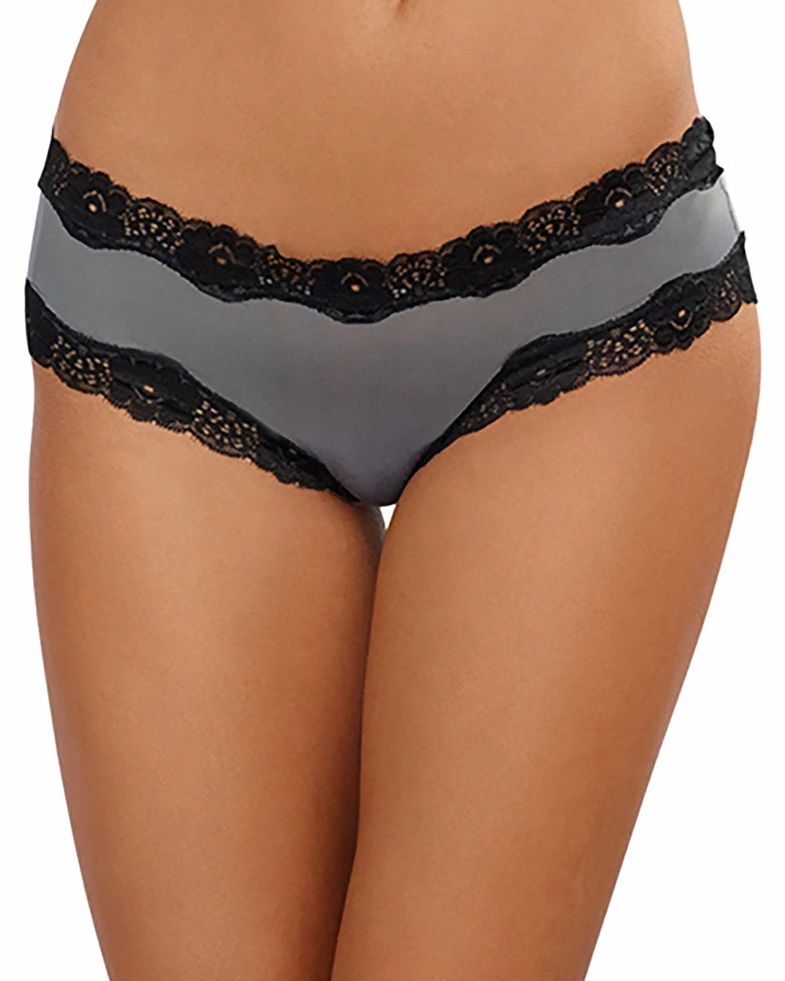 Microfiber cheeky panty with stretch lace trim and elastic criss-cross open back detail.