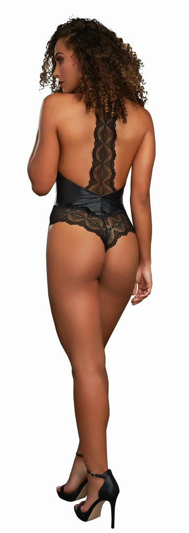 Feel like a bad girl in this Faux Leather Halter Bodysuit with sexy lace trim and a thong back!