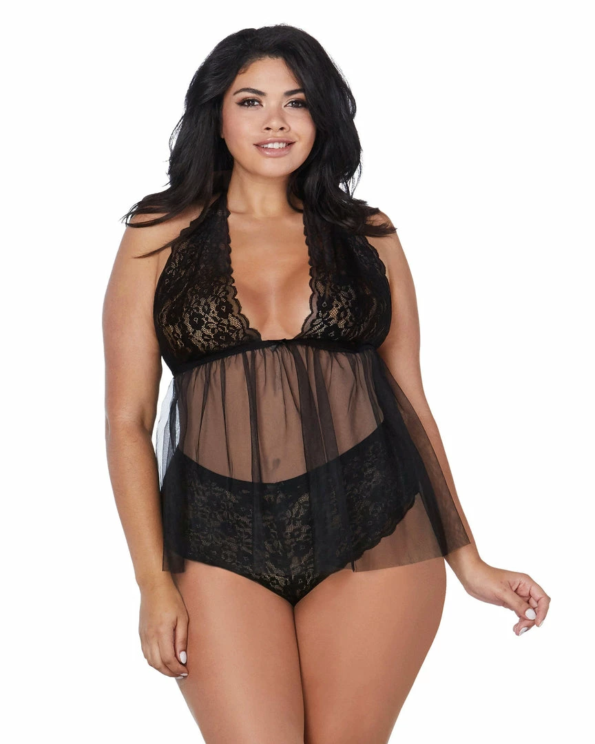 Dreamgirl International Retro Short Stretch Lace & Mesh Halter Babydoll With Fly-A-Way Back