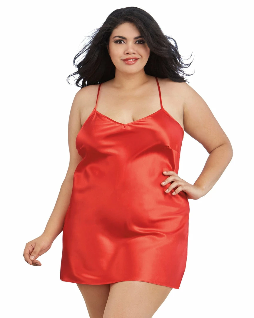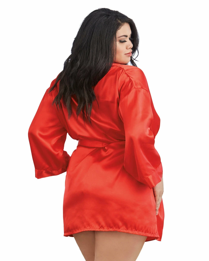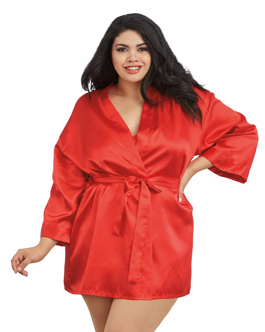 Plus size charmeuse short length kimono robe with attached belt and matching chemise with low back and adjustable criss-cross straps.