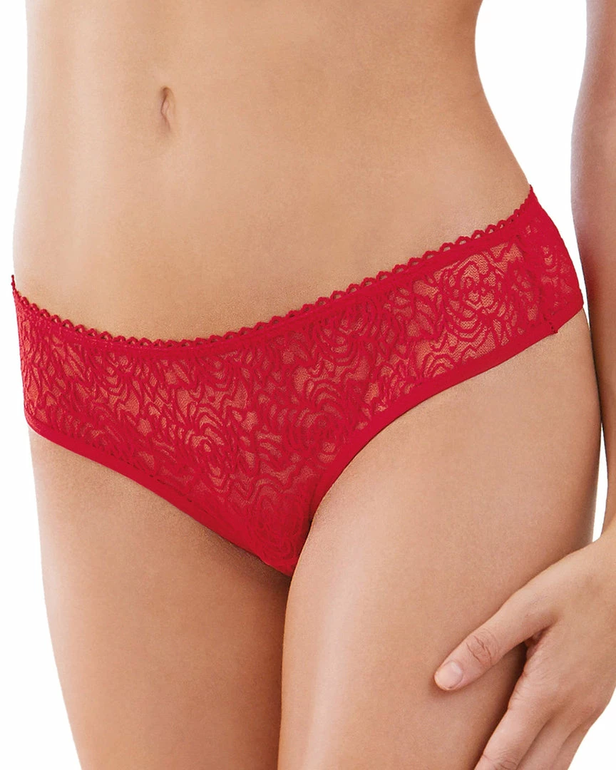 Stretch lace open crotch low rise panty with ruffled lace back detail.