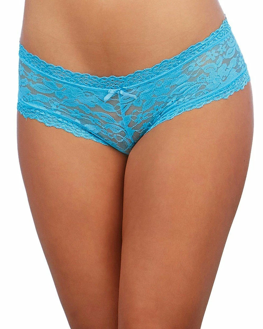 Stretch lace low rise cheeky hipster panty with scalloped lace & satin bow trim.