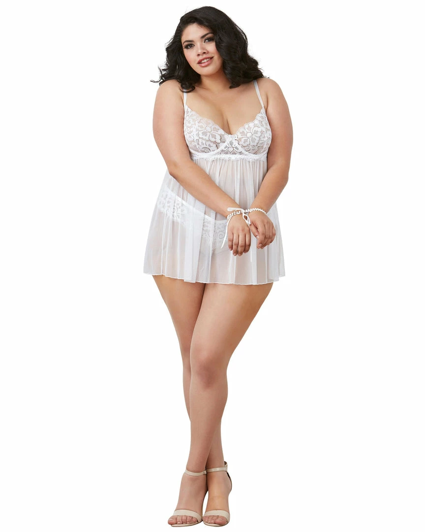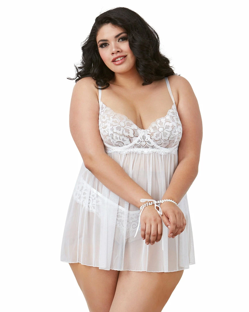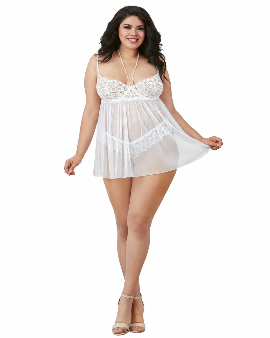 Plus-sized stretch lace and stretch mesh babydoll featuring a removable pearl neckline detail that can be used as wrist restraints.