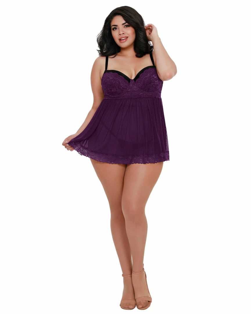 Plus size stretch mesh and lace babydoll with underwire push-up cups.