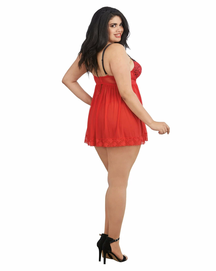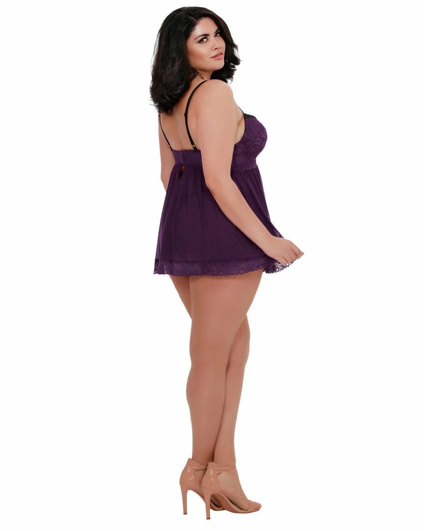 Plus size stretch mesh and lace babydoll with underwire push-up cups.