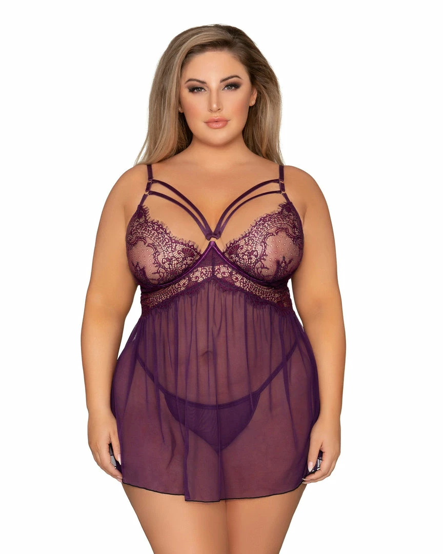 Plus size eyelash lace with black cording accent & stretch mesh babydoll featuring: