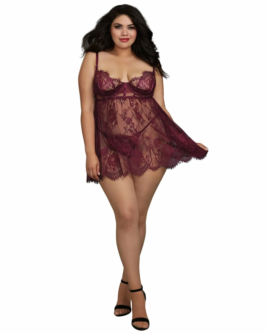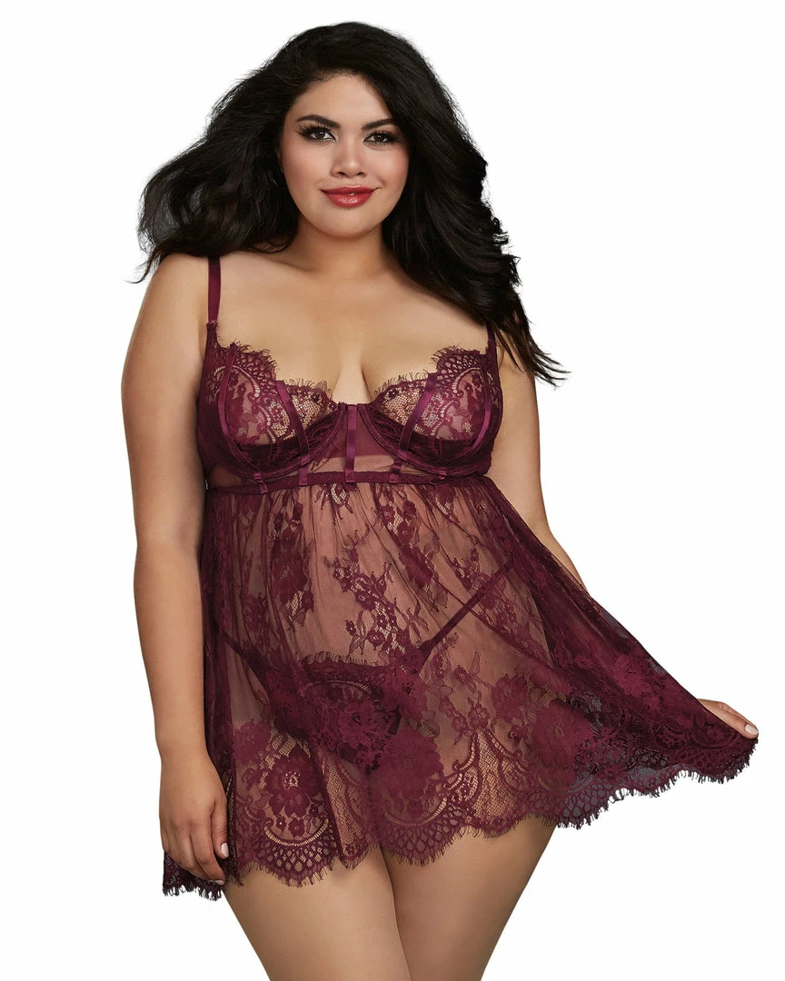 Plus-sized eyelash lace babydoll with satin elastic detailing, underwire cups, and satin demi-lining detail.