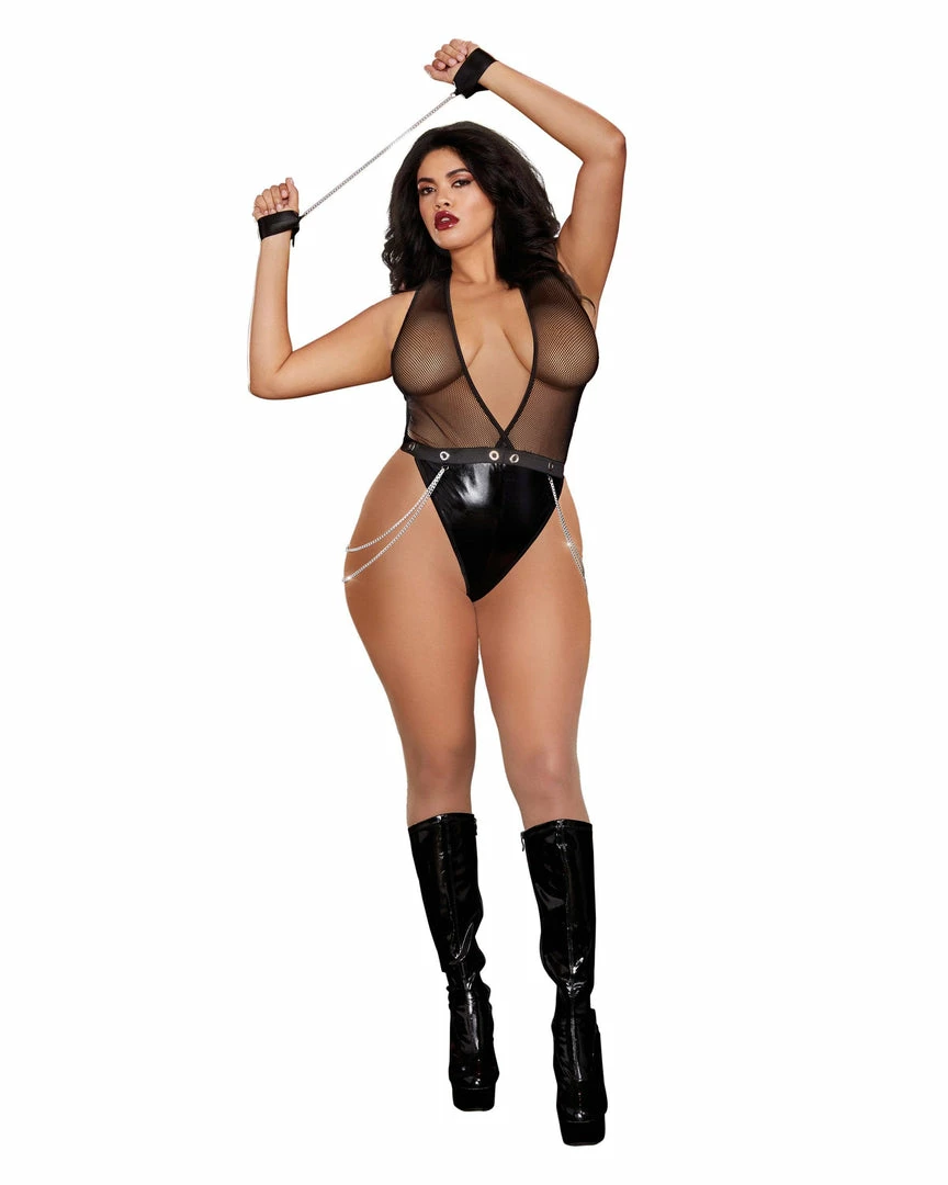 Wet look faux-leather and stretch fishnet deep plunge halter teddy.