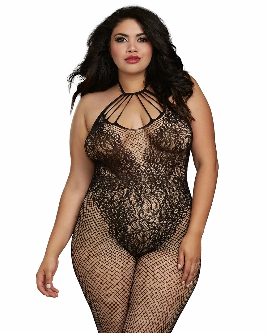 Plus-sized fishnet bodystocking with knitted ‘teddy’ design.