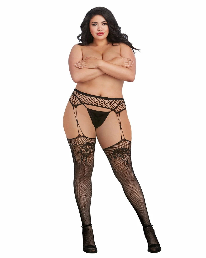 Plus-sized garter pantyhose with fishnet garter belt design and attached stockings with floral and fishnet details.
