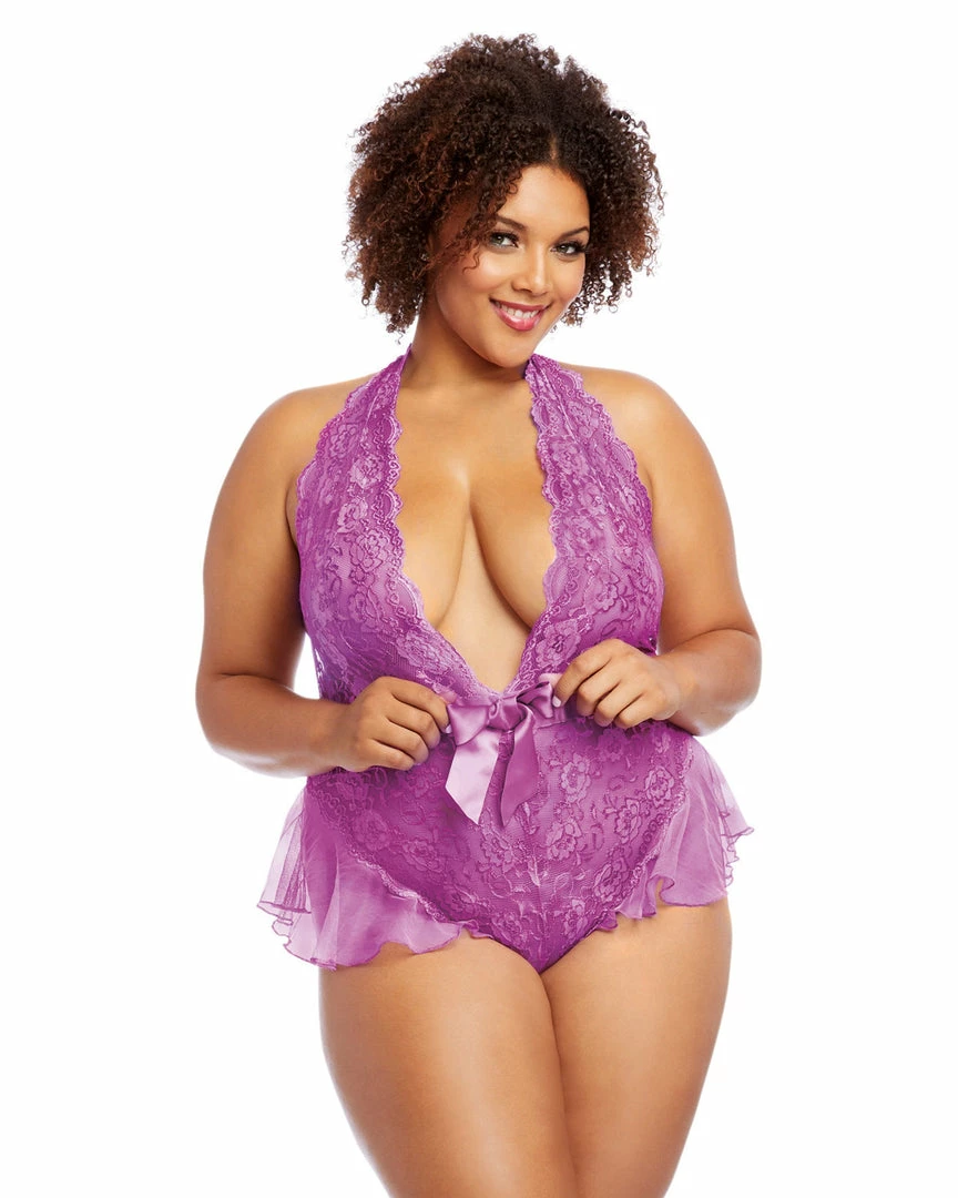 Dreamgirl International Plus Size Halter Plunge Lace Teddy With Flyaway Skirt