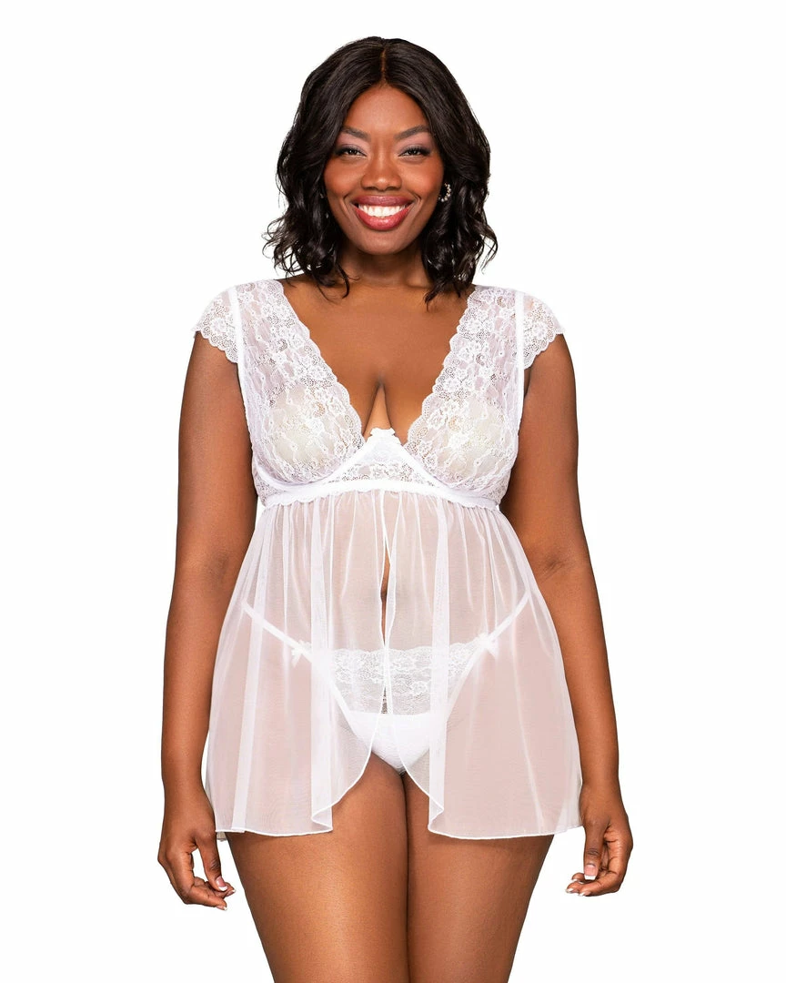 Plus size lace & mesh babydoll & G-string set featuring:
