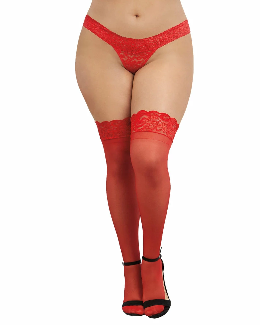 Plus size sheer thigh high stockings with stay up silicone lace top (thong not included).