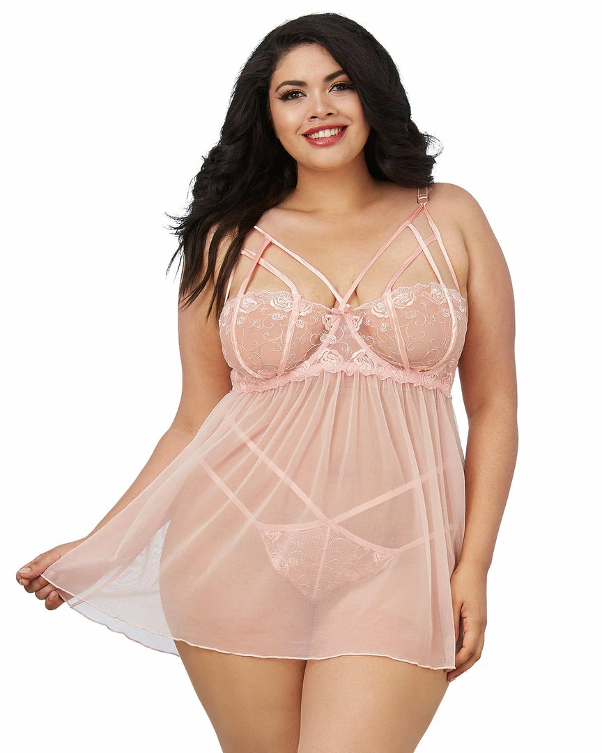 Opalescent mesh and embroidered lace chemise with satin strappy details.
