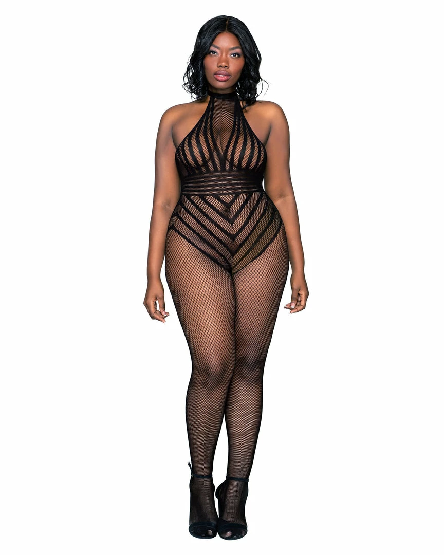 Plus size fishnet bodystocking with knitted stripped teddy design featuring: