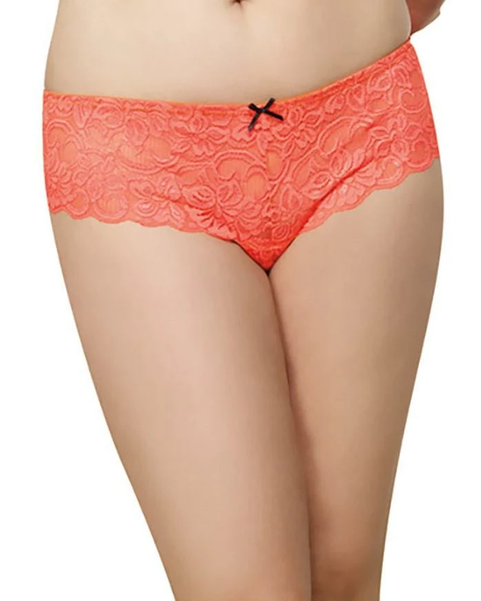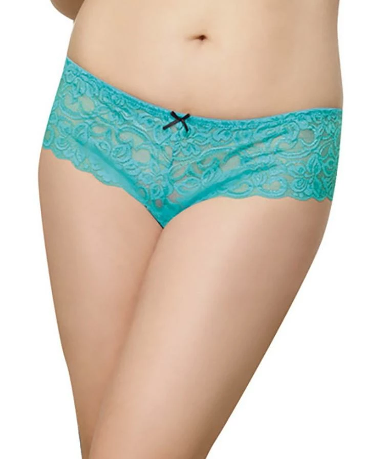 Plus size stretch lace open crotch cheeky boyshort with satin bow details.