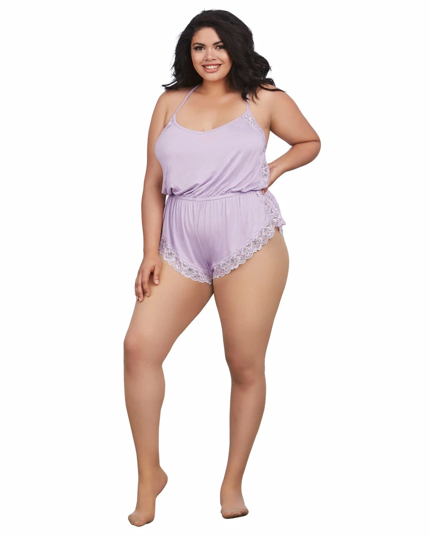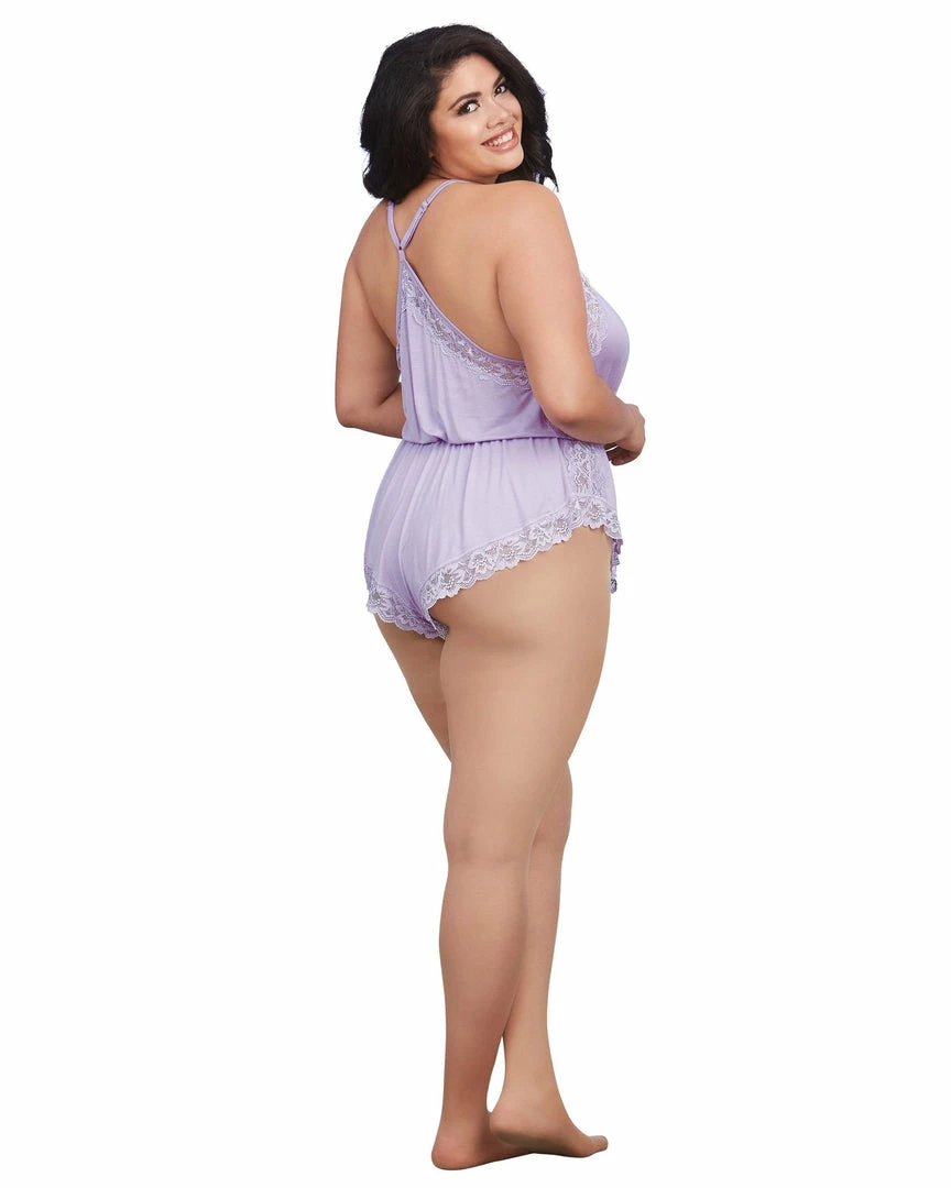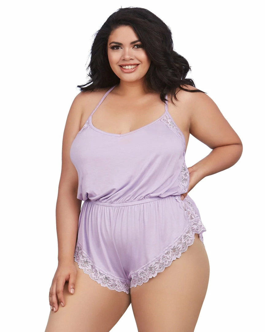 Plus-sized soft knit jersey sleepwear romper with scalloped lace trim details.