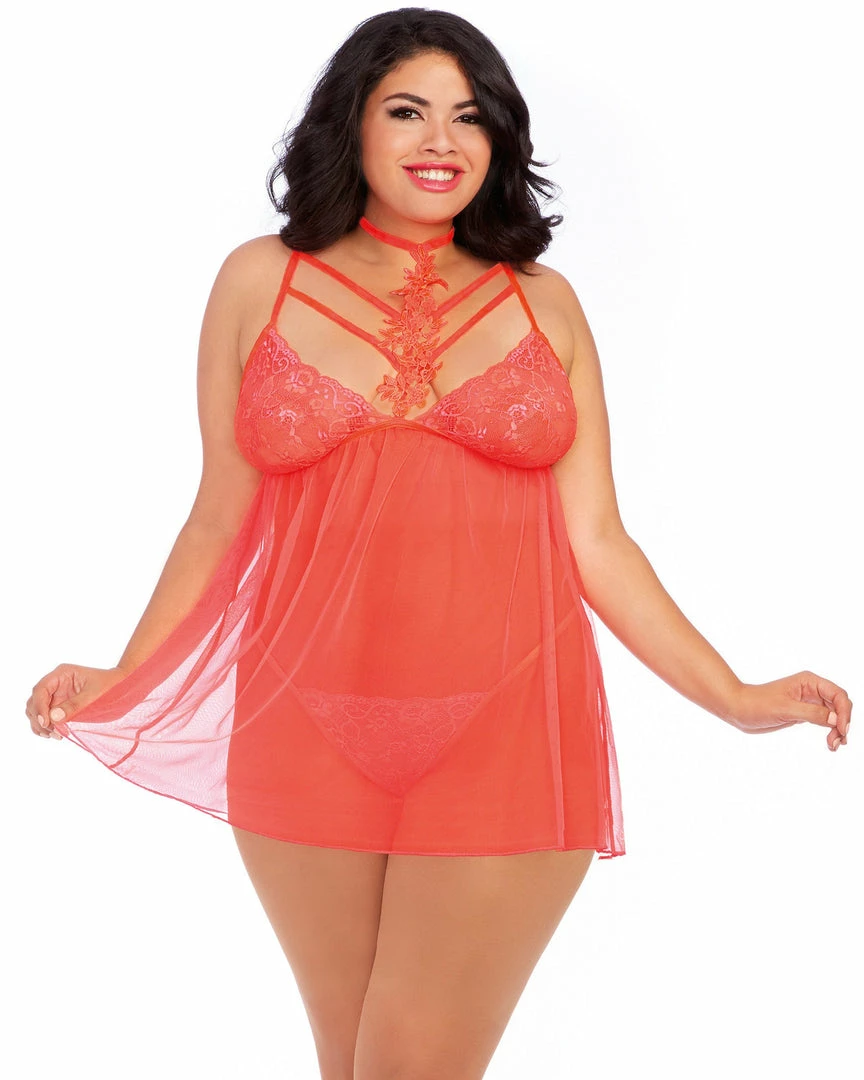Dreamgirl International Plus Size Venise Embroidery Lace Garter Babydoll With Thong