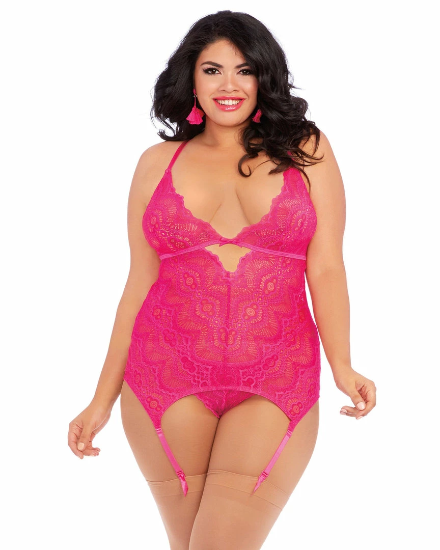 Plus-size stretch galloon lace garter slip with adjustable criss-cross straps.