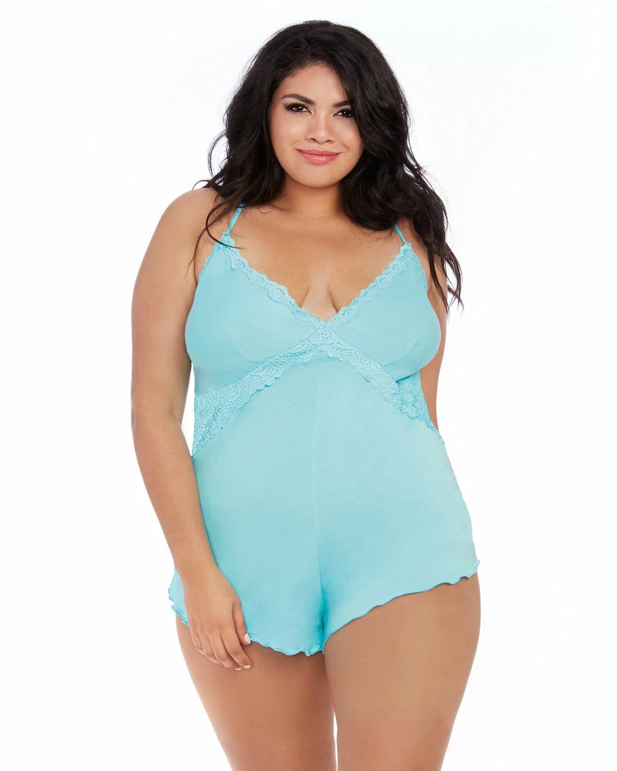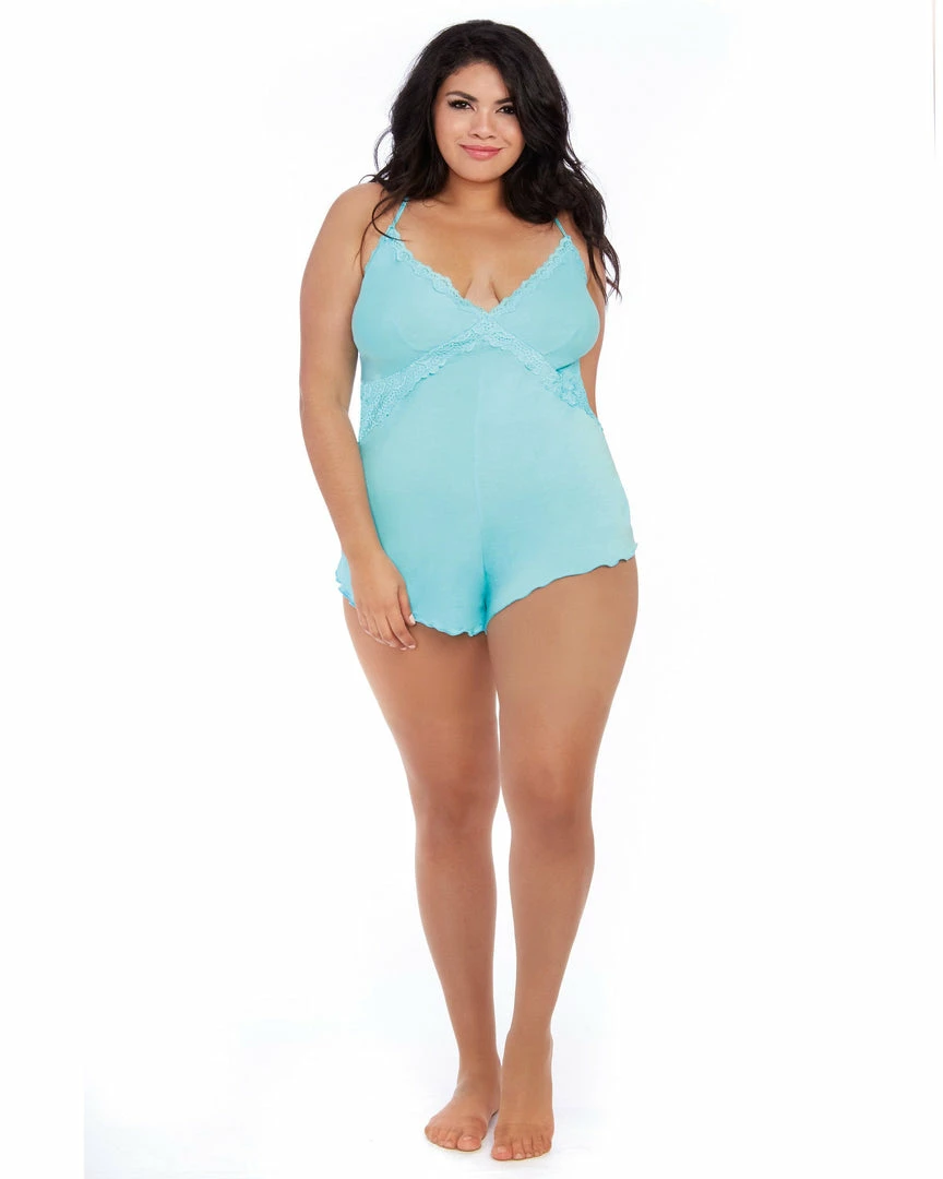 Plus-size stretch jersey romper with stretch galloon lace underbust detail.
