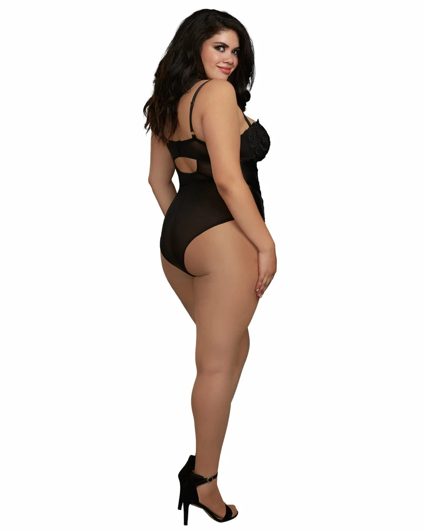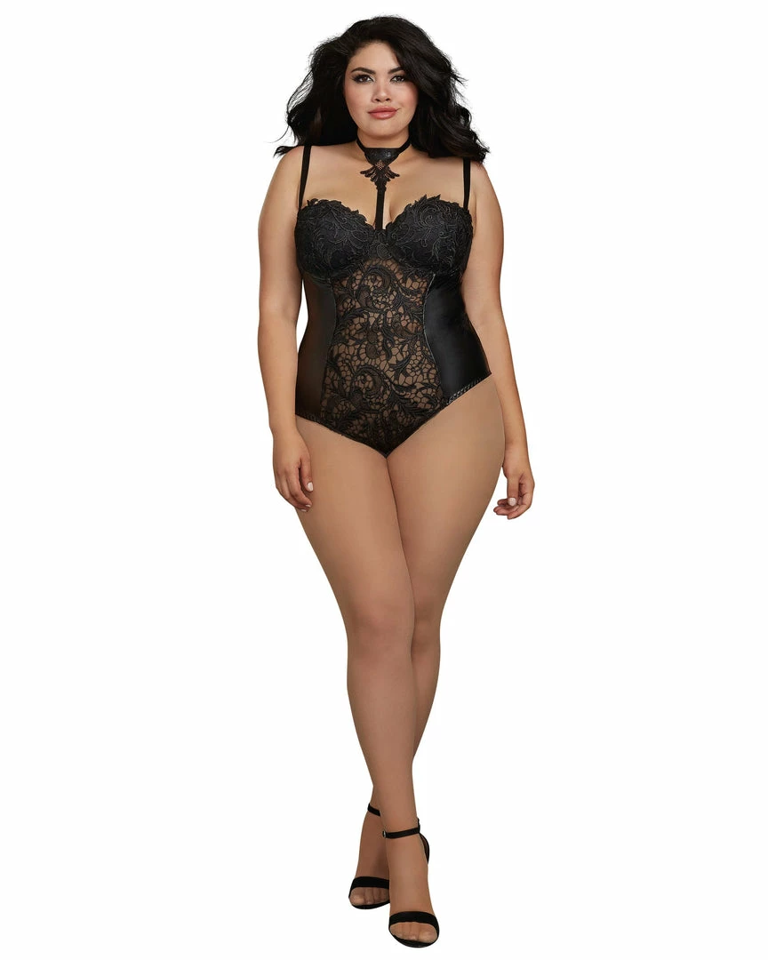 Plus-sized Venise lace and stretch faux leather teddy featuring underwire with molded cups, a Venise detail choker collar, and snap crotch closure
