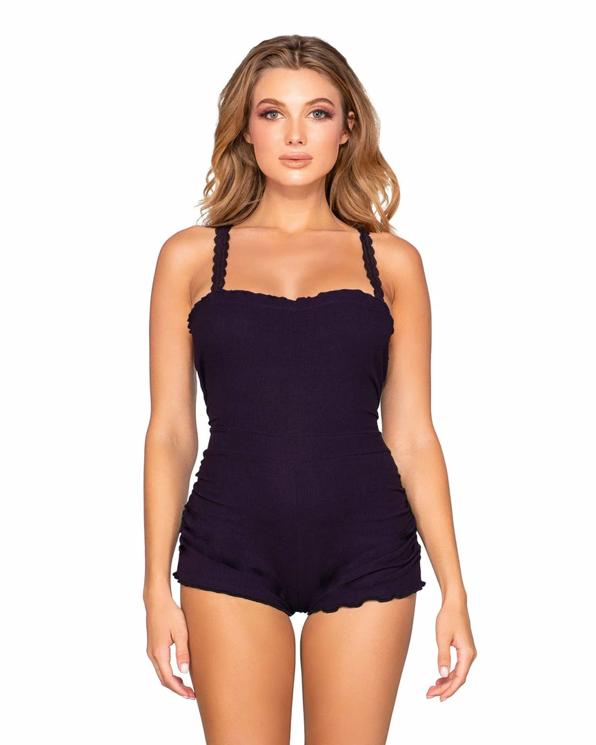 Dreamgirl International Soft Rib-Knit Jersey Sleepwear Romper With Lace Straps & Ruching Detail