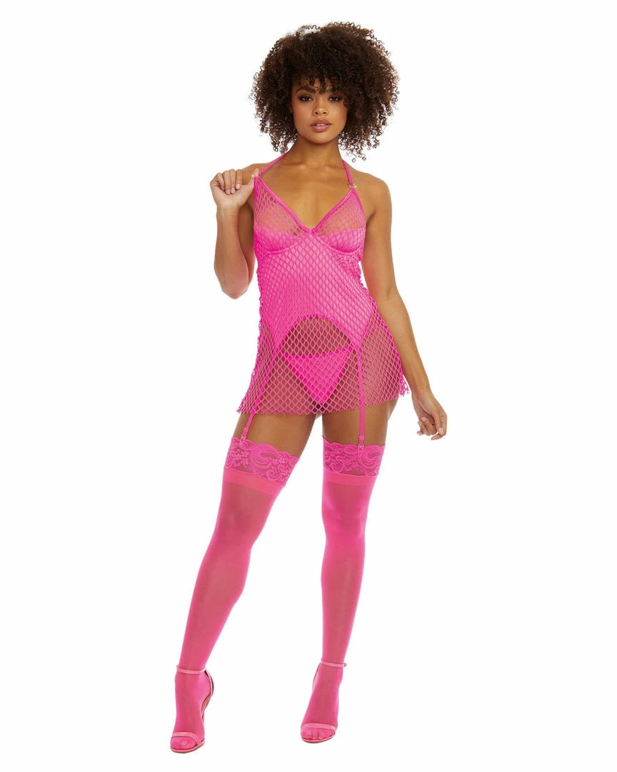 Large fishnet two-layer garter slip. Underwire cups with shelf bra lining accent and tie-back closure. Adjustable tie-back halter straps with silver ring detail. Attached microfiber bustier with attached/adjustable garters. Matching open crotch G-string included.