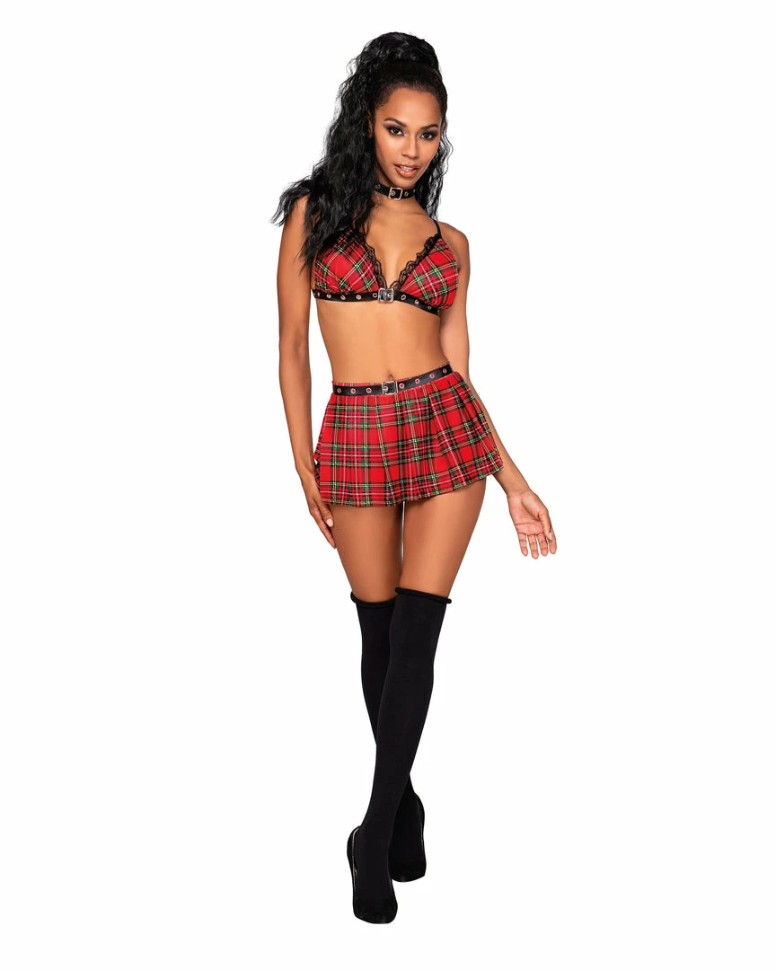 - Red plaid bralette with black lace ruffle, grommet leather trim & faux buckle details