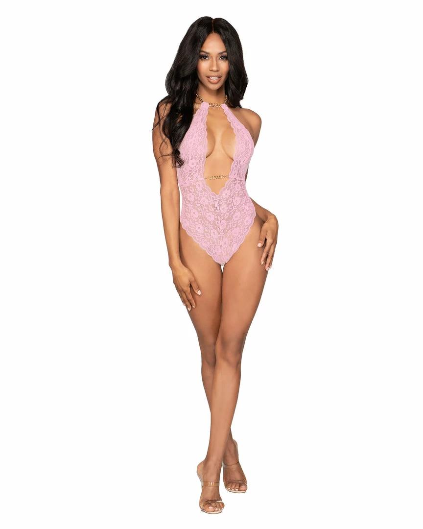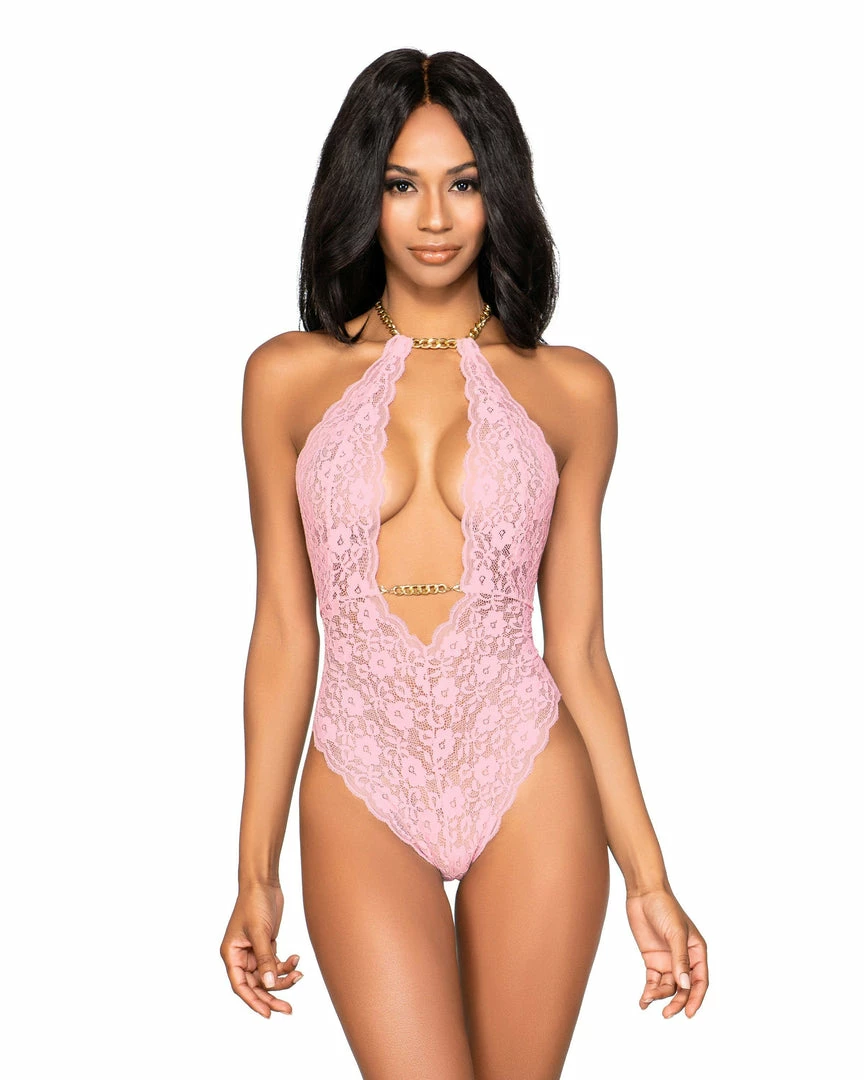 Stretch lace halter teddy with chain accents featuring: